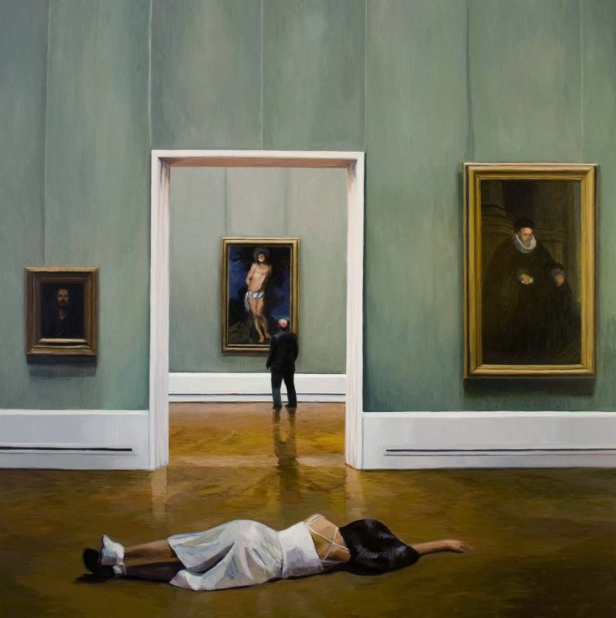 Lorsqu’elle ne danse pas, elle dessine d’ailleurs. Régulièrement exposés autour de ses spectacles, ses dessins au crayon ou au feutre mettent en scène des petits bonshommes gores qui s’adonnent aux actes les plus répréhensibles dans la joie et la bonne humeur. Comment exorciser la violence ? Cette question qui la taraude constitue assurément l’un des fils rouges de son travail : « Pas la violence réelle, qui se donne l’apparence de la vérité, plutôt la violence désamorcée par l’humour et par le rire. » De même que le diable se cache dans les détails, la violence se dissimule dans les musées. Elle peut nous surprendre à tout moment au détour d’un tableau de Rembrandt ou d’Albrecht Bouts : le corps d’un saint lapidé, la tête du Christ couronné d’épines… Elle cite aussi des tableaux qui ne sont pas vraiment violents mais qui mettent violemment mal à l’aise, telle cette vieille femme peinte par Géricault, au visage déformé par l’envie.