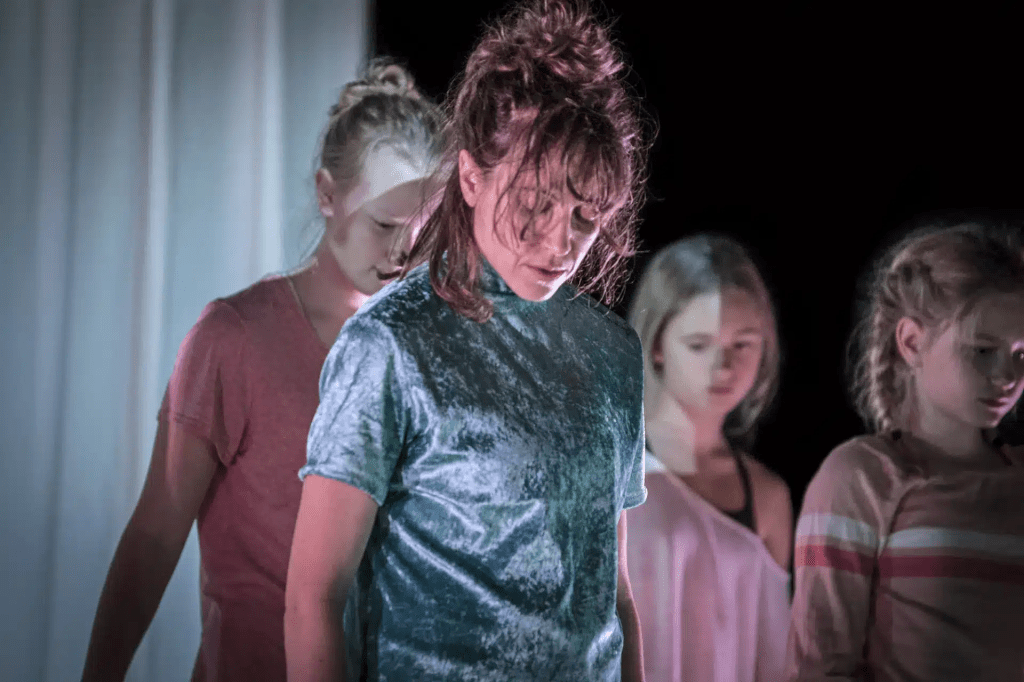 Le dispositif imaginé par Nicola Gunn est aussi simple que diaboliquement efficace. Un protocole est envoyé en amont aux théâtres, qui doivent constituer un groupe de cinq à dix enfants âgé·es de onze à treize ans. Ces enfants vont suivre quatre workshops de trois heures environ, qui ont lieu après l’école, pendant les week-end ou les vacances scolaires. La simplicité de ce protocole est à l’image de la facilité avec laquelle on peut résumer la performance : présente sur scène, Nicola Gunn répète avec les enfants des gestes et mouvements tandis qu’un texte est projeté en surtitrage par-dessus leurs têtes. Par une habile mise en abyme, le texte raconte l’histoire d’une artiste qui se rend à un rendez-vous professionnel avec le responsable d’une MJC située dans un quartier défavorisé, où elle monte un spectacle avec des enfants. La situation lui échappe après que des parents se sont plaints et ont décidé de retirer leur fille du projet.